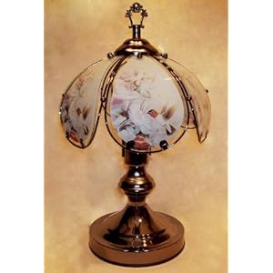 Standing 14" tall the base includes a pewter-colored black chrome) base. Touching the base anywhere turns the lamp on and off and controls these power settings. The thing that makes this lamp so delightful, however, will be the shade. In a black metal framework are 6 panels of glass. Each panel has a photo of a beautiful hummingbird hovering at flowers. The inscription says: To everything there's a season, plus a time to every purpose under heaven. The diameter from the shade is 9 inches. A 40-watt bulb is included. Some assembly is needed for those in our lamps.